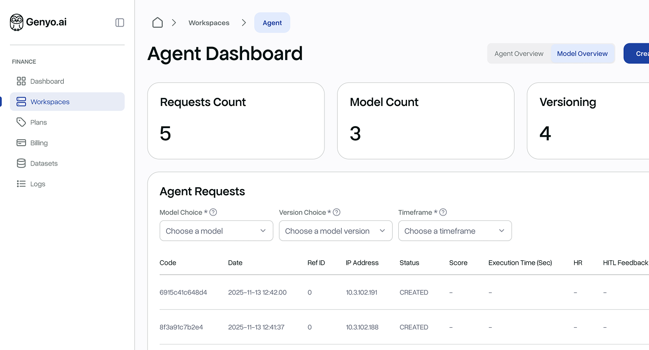 Genyo.ai’s dashboard provides full visibility across models, datasets, performance metrics, and governance status — all in one place.